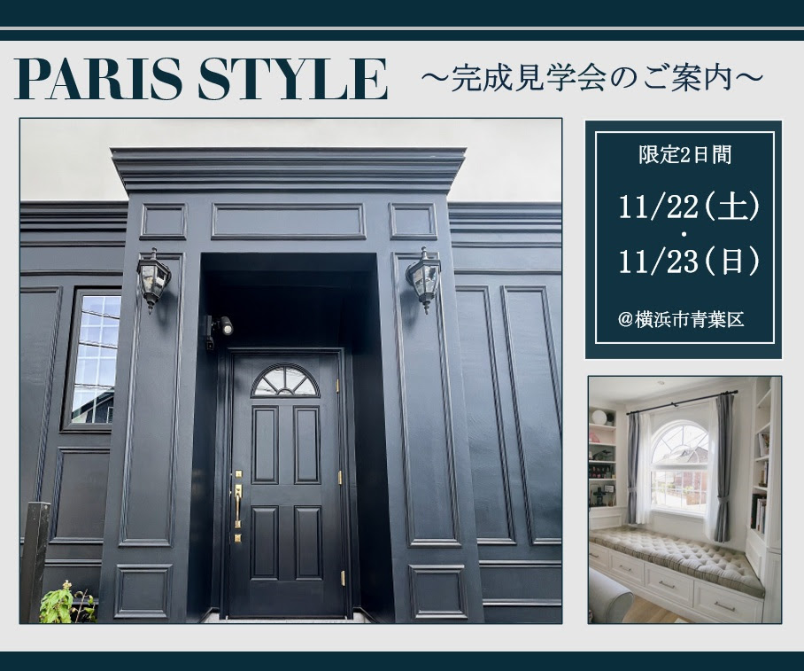 フランス邸宅のエッセンスを随所に散りばめた「パリスタイル」の住まいを、2日間限定で公開します。外観は深いネイビーと白のコントラストでディテールまで美しく仕上げた1棟です。写真では伝わりきらない質感と空気感を、ぜひ現地でご体感ください。